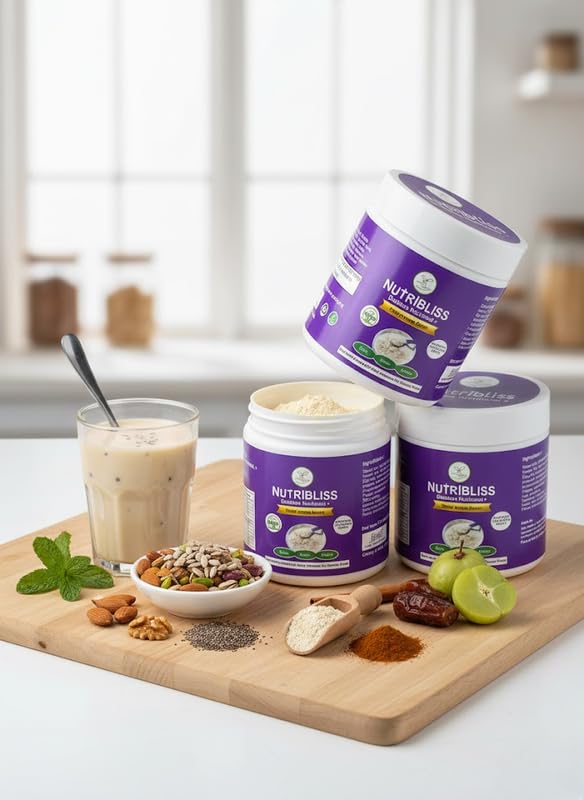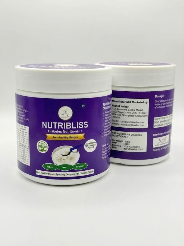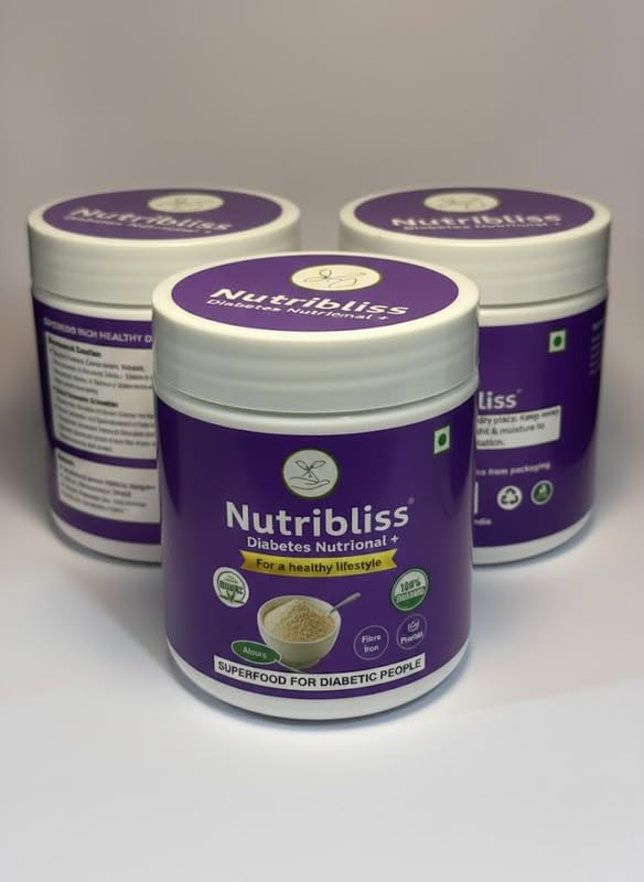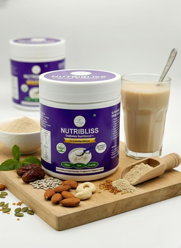 Nutribliss Diabetes Nutritional+ is a plant-based nutritional blend designed for diabetic and diet-conscious individuals. It combines premium roasted nuts, seeds and herbs including almonds, walnuts, cashews, foxnuts, chia, flax, pumpkin seeds, cinnamon and fenugreek. The formula provides natural fibre, protein and micronutrients without added sugar or artificial additives. This nutritional mix can support satiety and help reduce unhealthy snacking habits. It can be consumed as a light breakfast, mid-meal drink or evening snack by mixing with warm water, milk or curd. Suitable for adults seeking clean and balanced nutrition as part of a controlled diet.