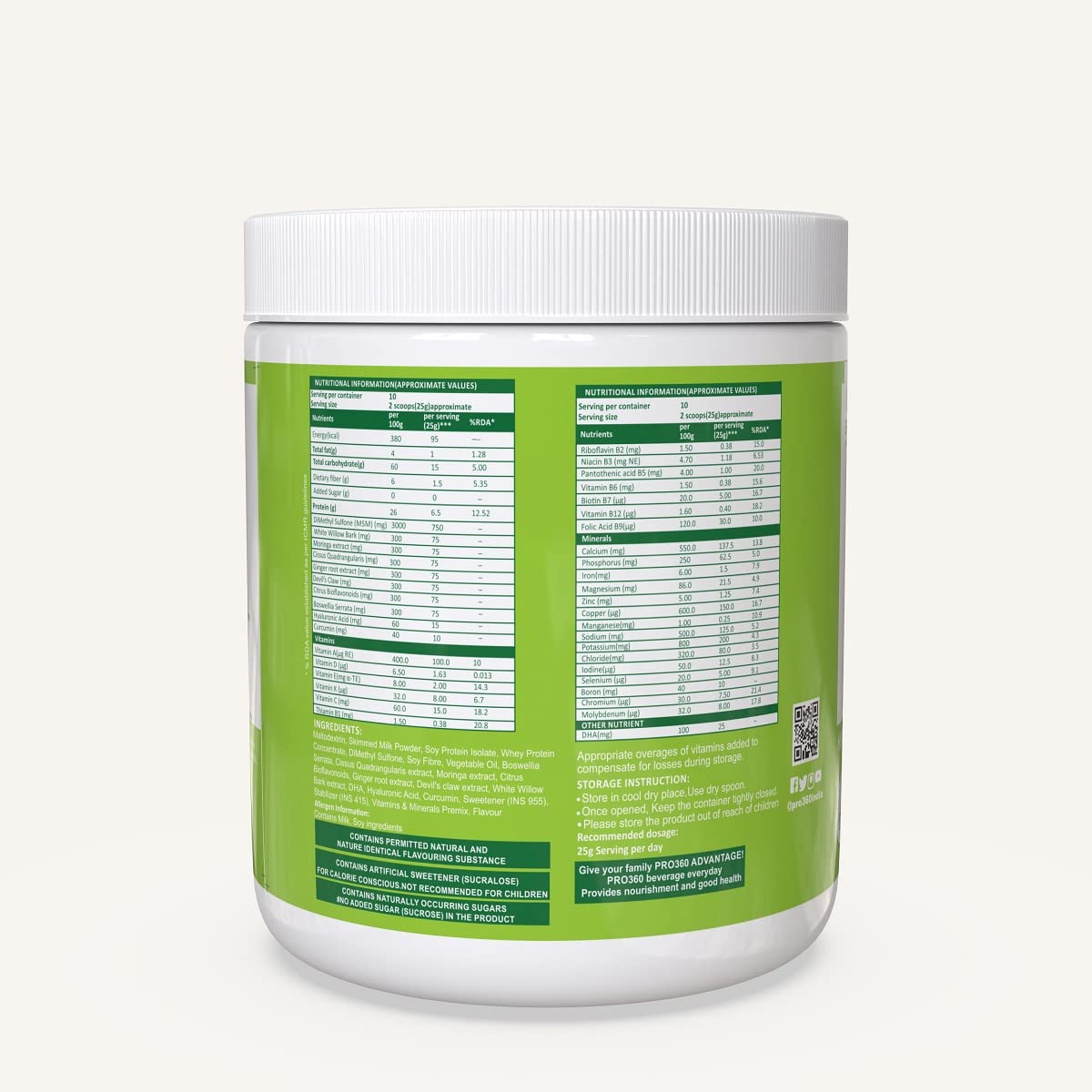 Pro360 presents Ortho (Veg) Adult Nutrition Protein Health Drink Powder for Ortho Care which is enriched with extract of many herbs which work in unison for the betterment of bones and joints. Our Pro360 Ortho care drink also contains hyaluronic acid, boron, calcium and blended with aromatic taste of vanilla flavour.