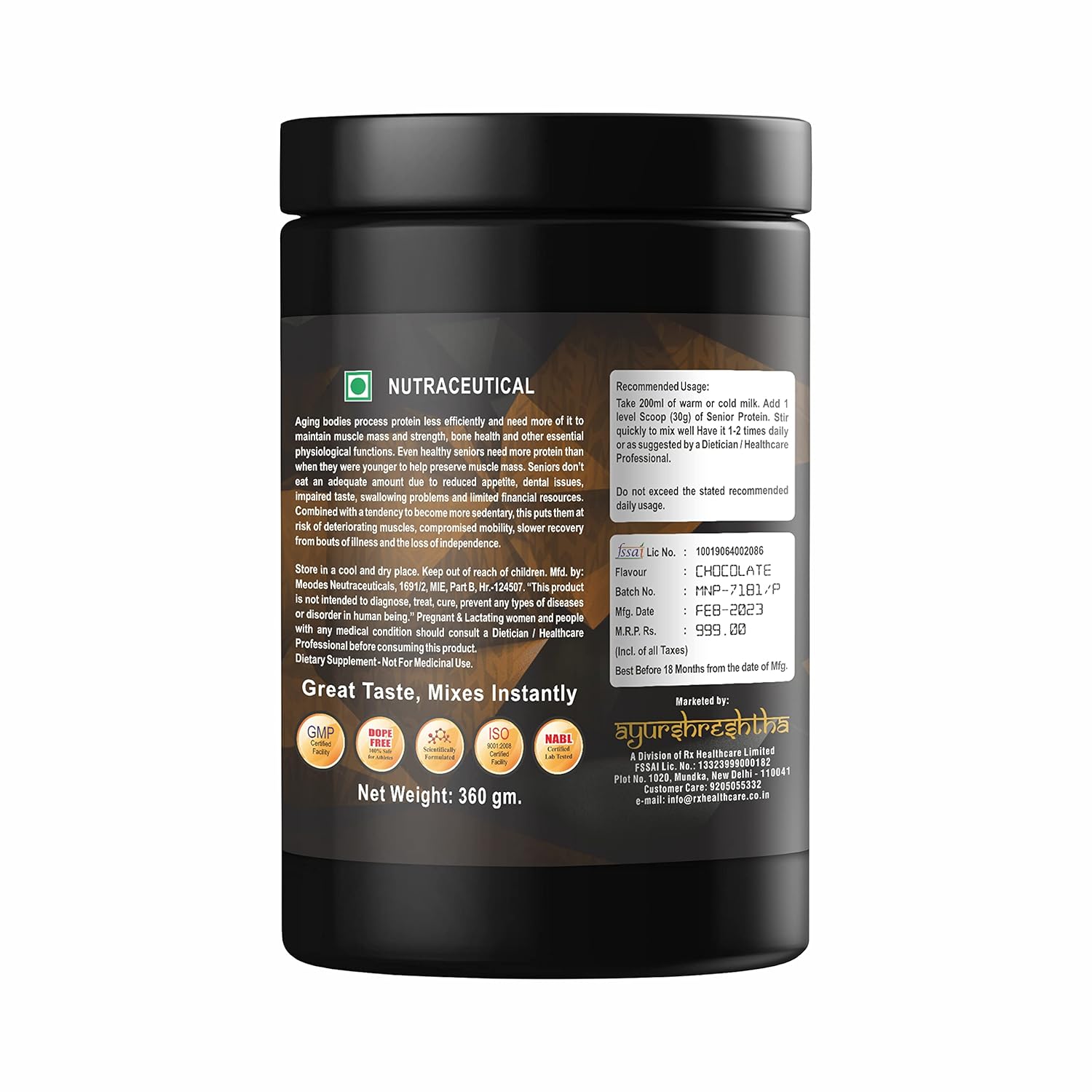 Ayurshreshtha Pure & Gold Senior Protein Powder is exceptional & is specifically formulated to cater to the unique nutritional needs of seniors. As individuals age, maintaining muscle strength and overall health becomes increasingly important. Ayurshreshtha Pure & Gold Senior Protein Powder offers a convenient and effective solution to support seniors in achieving optimal well-being. Designed with careful consideration of the requirements of people above the age of 40 moving towards their senior-hood, Ayurshreshtha Pure & Gold Senior Protein Powder is a blend of high-quality, easily digestible proteins sourced from premium ingredients. It is enriched with essential nutrients and fortified with key vitamins and minerals crucial for maintaining muscle mass, bone health, and overall vitality. Ayurshreshtha Pure & Gold Senior Protein Powder provides a balanced amino acid profile, including essential amino acids, which plays a vital role in protein synthesis and muscle maintenance. Regular consumption of the supplement can assist seniors in preserving muscle mass, aiding in muscle recovery, and promoting healthy aging. Not only does our protein powder deliver superior nutrition, but it also takes into account the taste preferences and potential challenges that seniors may face. We have crafted a delicious, chocolate flavoured, smooth-textured, sugar free formula that is easy to mix, ensuring a pleasant and hassle-free experience. Furthermore, our Senior Protein Powder is carefully formulated to accommodate common dietary restrictions and sensitivities. It is gluten-free, contains no artificial additives, and is suitable for diabetic individuals. This ensures that seniors with varying dietary needs can safely and comfortably incorporate it into their daily routine. With our Senior Protein Powder, seniors can enhance their protein intake conveniently and enjoy the numerous benefits it offers. Boosting muscle strength, supporting bone health, and promoting overall well-bein