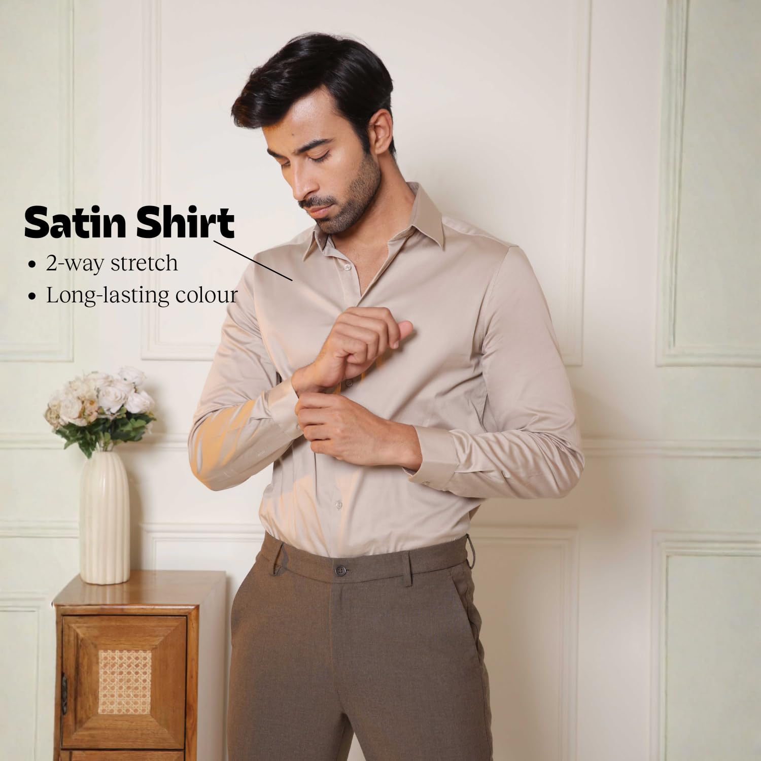 2-way stretch satin offers flexibility and ease — lets you move freely while maintaining the shirt’s structure.