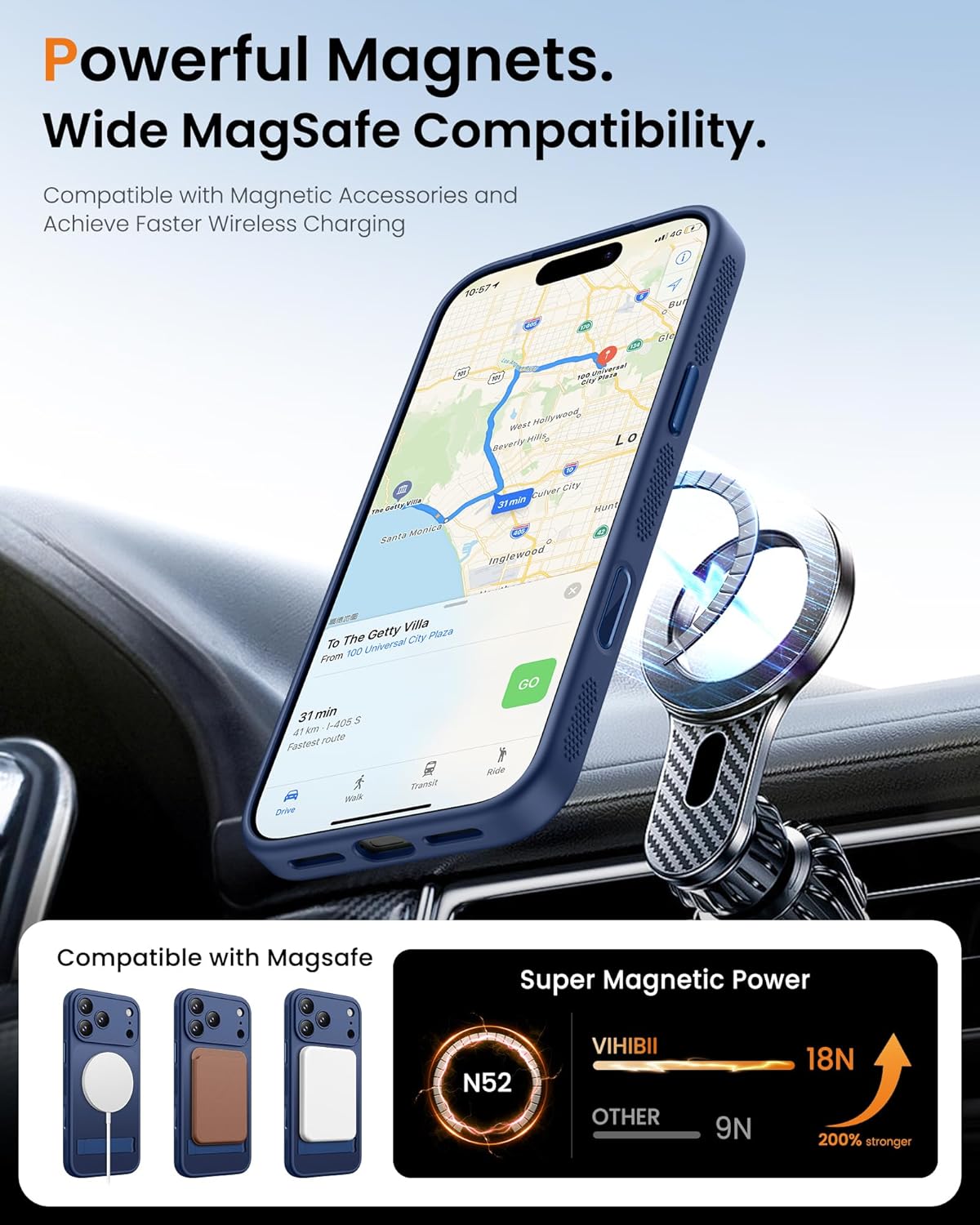 【Comaptible with Magsafe】This iPhone 17 pro cover case features a built-in strong N52 magnetic ring that ensures perfect alignment with magnetic chargers and accessories. It delivers a faster, more stable charging experience while keeping your phone securely attached to wallets, power banks, and car mounts. No need to remove the case — enjoy full functionality, reliable protection, and effortless everyday use