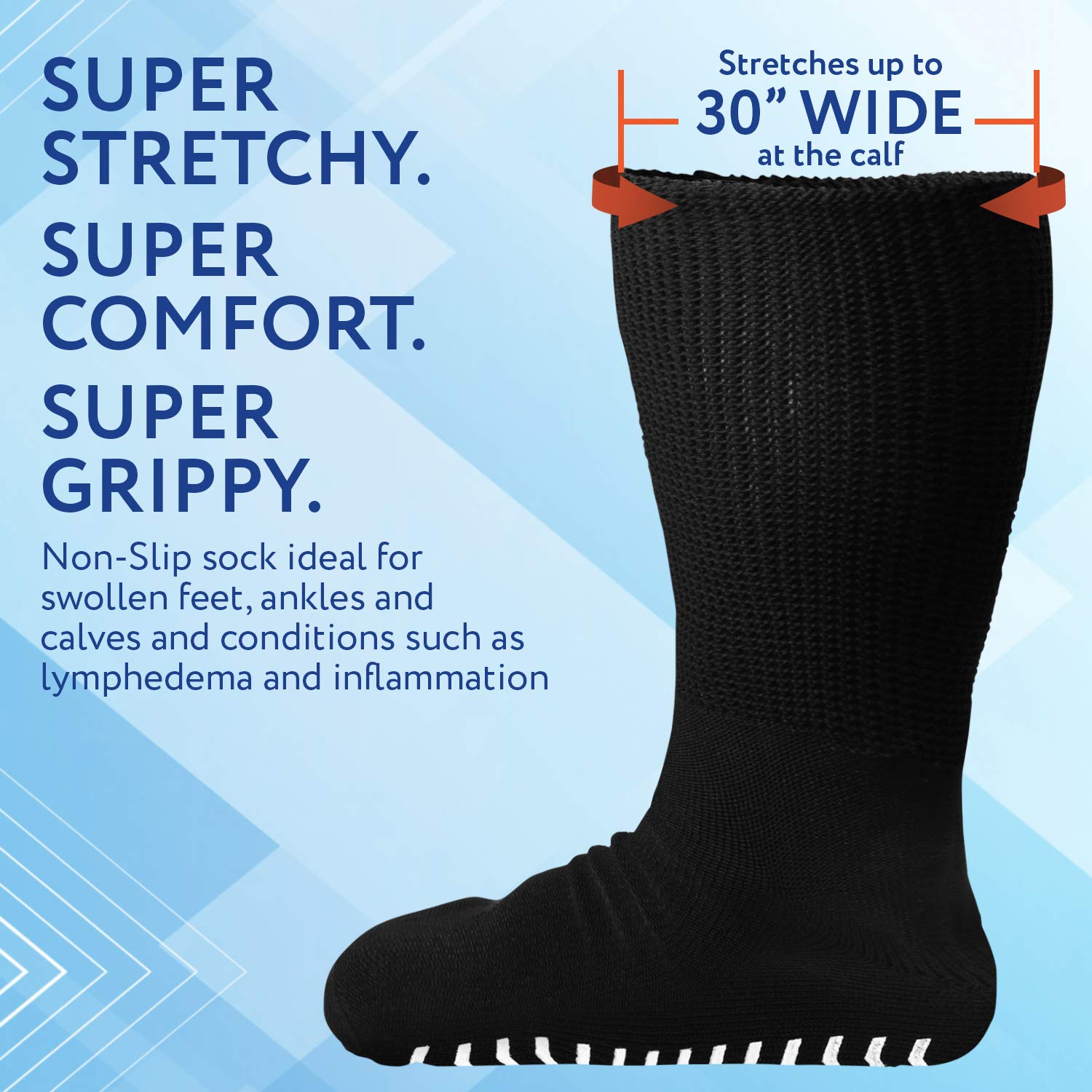 2 Pairs of Super Wide Socks with Non-Skid Grips for Lymphedema – Bariatric Sock – Oversized Anti-Slip Sock Stretches up to 30” Over Calf for Swollen Feet and Mens and Womens Legs – One Size Unisex