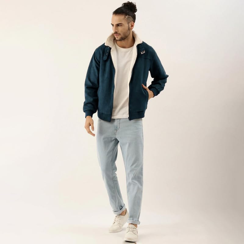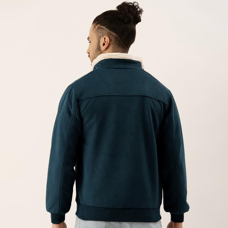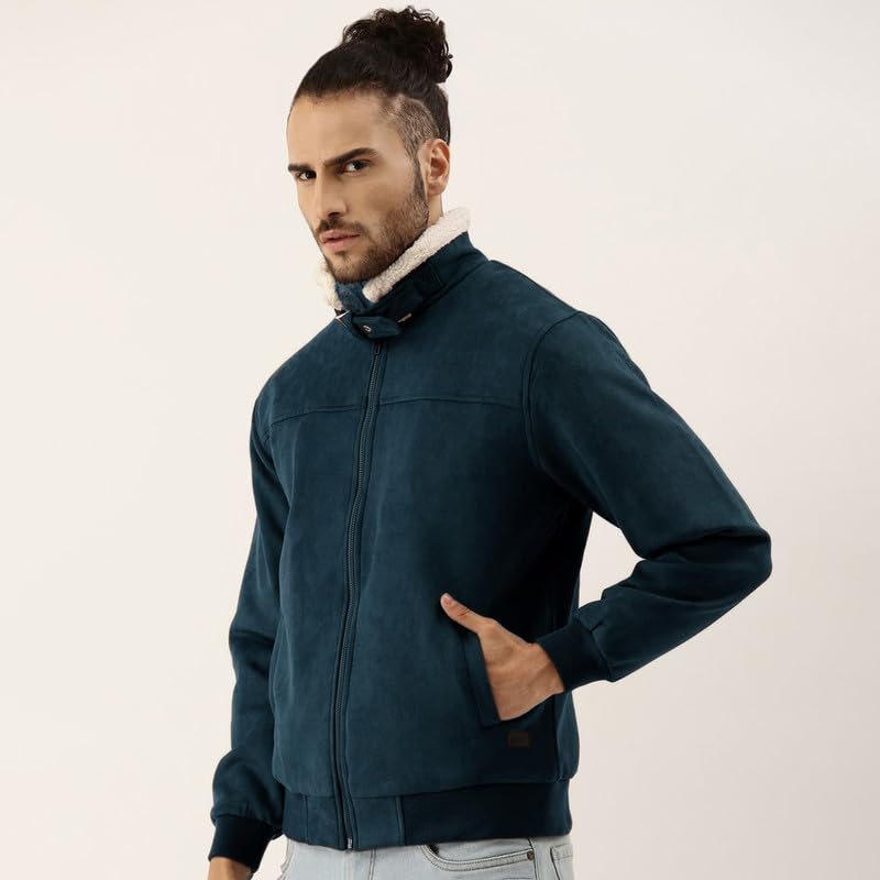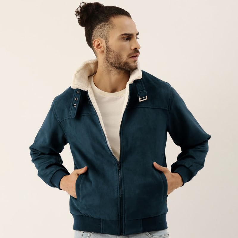 Campus Sutra Men’s Fur-Lined Suede Bomber Jacket For Casual Wear | High Neck | Long Sleeve | Zipper Closure | Jacket Crafted With Comfort Wear For Everyday Wear