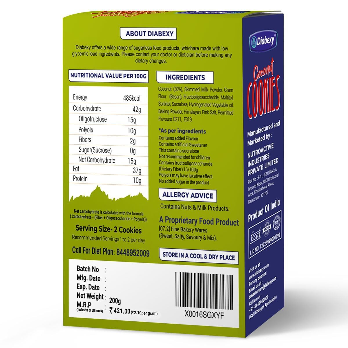 NO MAIDA – Diabexy Diabetic Cookies are made using high quality imported California Almonds, pure cocoa powder, pure coconut, hazelnuts as base which has a very low glycemic load. We do not use maida, wheat flour or any other cheap flour at all. We use high quality trans-fat free bakery shortening.