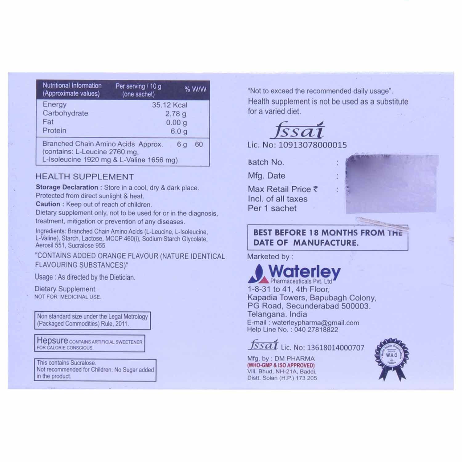 Composition: L Isoleucine-1820Mg+L Leucine-2760Mg+L Valine-1656Mg. This product will have minimum 3 months’ expiry at the time of order dispatch.