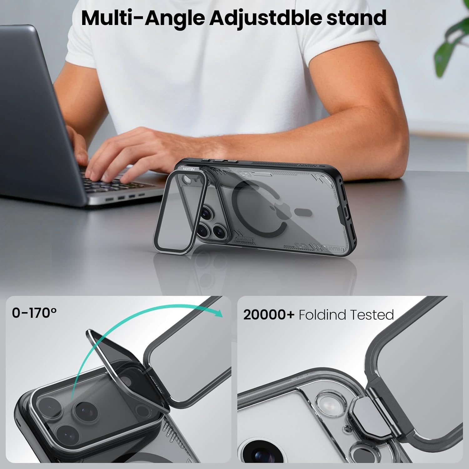PRITO Nilkin® Magnetic Case for iPhone 17 Pro Max, Shockproof Protection with MagSafe, Never Yellowing and Biodegradable Material, with Stand & Transparent Camera Lens Cover (Black, iPhone 17Pro Max)