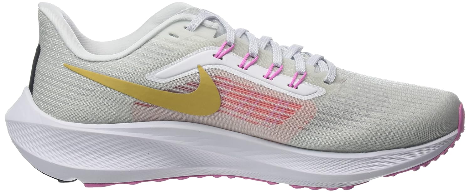 Nike Pegasus 39 Women’s Road Running Shoes Let the Nike Pegasus 39 help you ascend to new heights. More lightweight up top than the Pegasus 38 and ideal to wear in any season, it has a supportive sensation to help keep your feet contained, while underfoot cushioning and double Zoom Air units (1 more than the Peg 38) give you an extra pop to your step. Your trusted workhorse with wings is back. Time to fly. Total Comfort Extra padding at the tongue and collar helps keep you foot feeling comfortable. We also placed engineered mesh—which is stronger and more flexible than regular mesh—throughout the top for lightweight breathability. Supportive Steps Flywire technology is integrated with a midfoot band for total support that helps keep your feet in place. Snap, Run and Pop Nike React technology is a lightweight, durable foam that delivers a smooth, responsive ride. We paired it with an Air Zoom unit at the forefoot and heel for an energized feel. Smooth Transitions The heel shape is designed to maximize landing, helping you easily transition from heel to toe. We paired it with thick foam for a responsive ride. Tongue is separated from the upper to give room for different feet shapes. Waffle-inspired outsole gives you excellent traction. Grooves on the rubber sole allow for natural motion. More Details Not intended for use as Personal Protective Equipment (PPE)