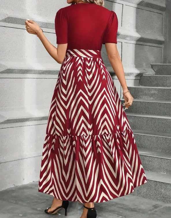Make a stunning impression with this beautifully crafted midi dress featuring a striking burgundy and white chevron pattern. The dress combines classic elegance with modern comfort, showcasing a flattering empire waistline that gracefully transitions into an A-line silhouette. The short sleeves offer just the right amount of coverage, while the midi length maintains sophistication for various occasions. A standout feature is the inclusion of practical pockets, perfect for carrying small essentials. The contrasting pattern creates a visually appealing geometric effect that elongates the silhouette. The dress’s versatile design makes it suitable for both formal events and casual outings. The fabric drapes elegantly, creating a feminine and flowing movement as you walk. Style this dress with heels and a clutch for special occasions, or dress it down with flats for a more casual look. The combination of the solid burgundy bodice with the patterned skirt creates a harmonious balance that’s both eye-catching and sophisticated.