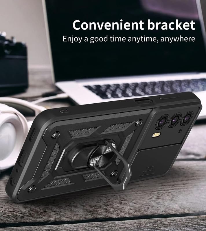 SkyTree Robotic Sliding Camera Window Shock Proof Thunder Case, Dual Layer Hybrid Shockproof Back Cover Case with Kickstand for Motorola Moto G56 5G – Black