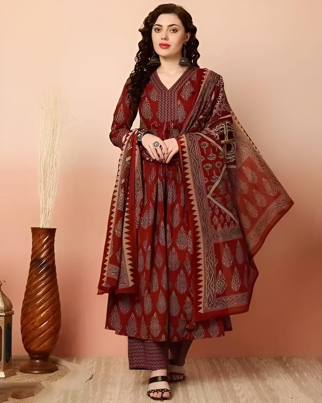 Step into effortless grace with this beautifully designed maroon kurta set featuring classic paisley motifs and traditional block-inspired prints. The rich color palette and detailed patterns create a perfect blend of heritage and modern charm.