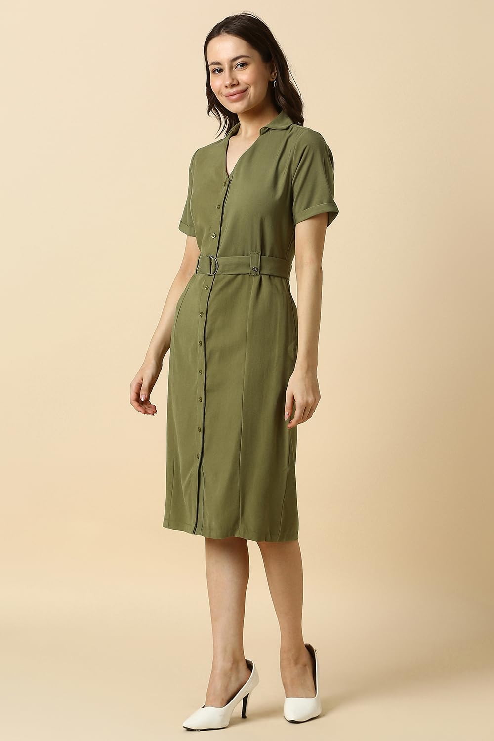 Step into elegance with this Allen Solly formal dress, tailored for the modern woman. Crafted from a premium blend of rayon and polyester, this olive-hued piece offers a refined look with a comfortable, regular fit. Featuring a solid pattern and short sleeves, it`s perfect for formal occasions where sophistication matters. Elevate your wardrobe and showcase your style effortlessly with this timeless dress.