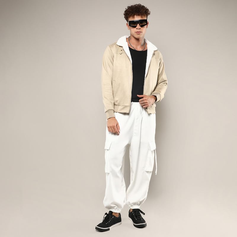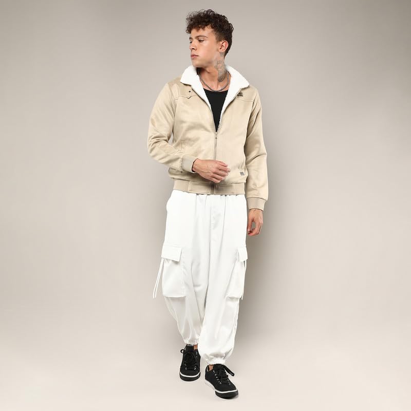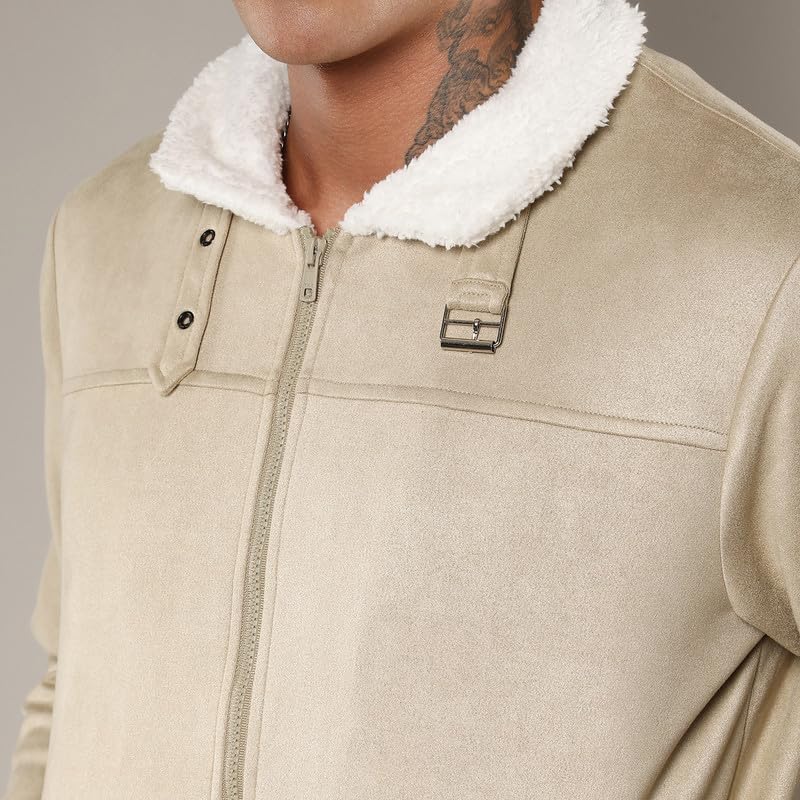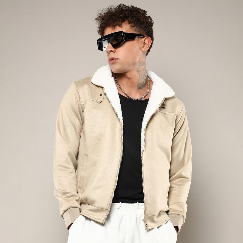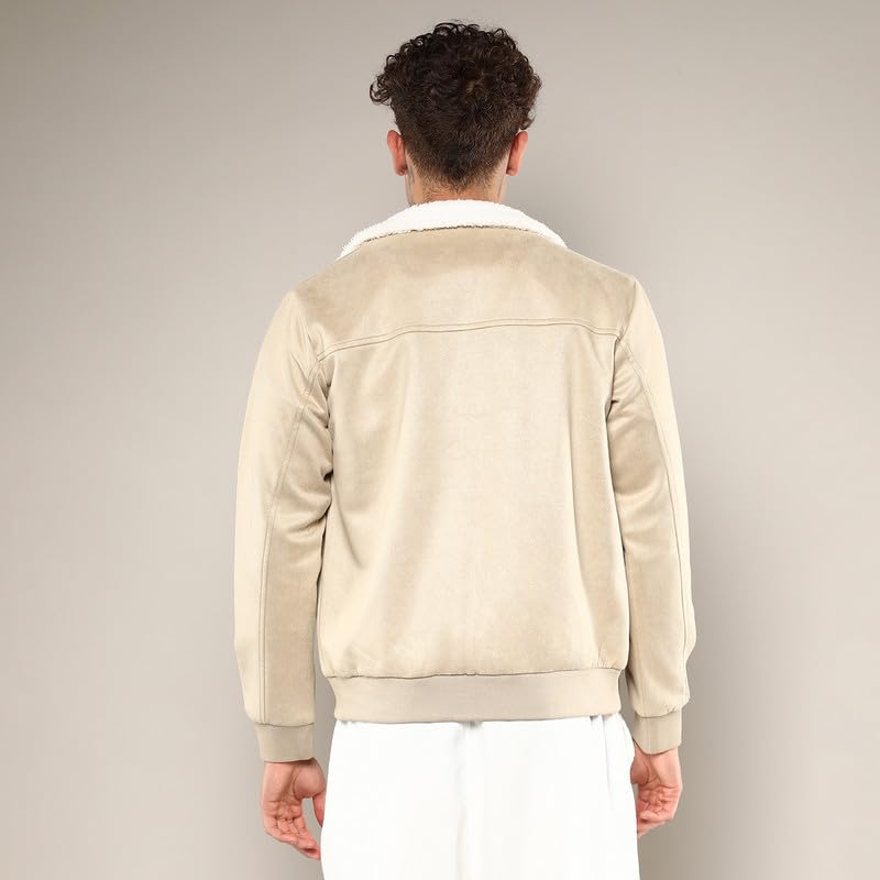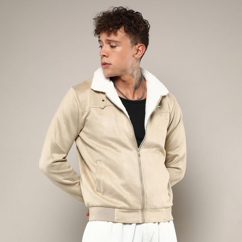 Campus Sutra Men’s Fur-Lined Suede Bomber Jacket For Casual Wear | High Neck | Long Sleeve | Zipper Closure | Jacket Crafted With Comfort Wear For Everyday Wear