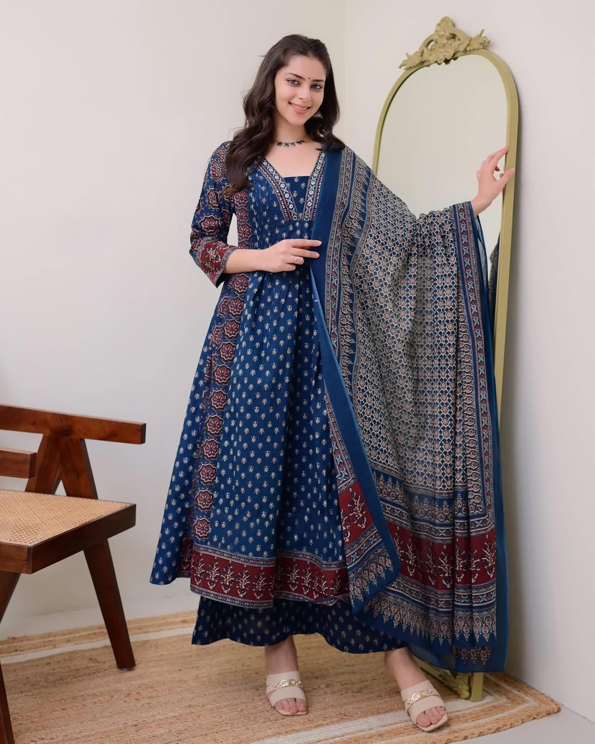 ANNI Designer Women’s Pure Cotton Anarkali Kurta Set for Women with Dupatta & Plazzo – Hand Block Print Suit Set | Stylish Dress | Cotton Kurta Set for Women
