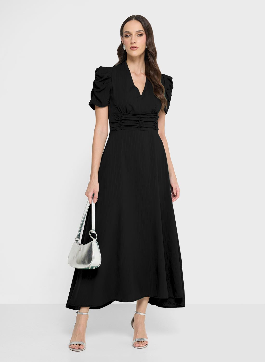 Make a stunning statement with this elegant black maxi dress that combines sophistication with modern style. The dress features a flattering V-neckline and short puff sleeves that add a touch of romance to your look. The carefully designed cinched waist creates a beautiful silhouette, while the A-line cut flows gracefully to a midi length. Crafted from a premium blend of 95% Polyester and 5% Spandex, this dress offers both comfort and durability. The versatile design makes it perfect for various occasions, from formal events to evening parties. The black colour offers timeless elegance that can be dressed up or down with accessories. The waist-fitting design accentuates your natural curves while maintaining a comfortable fit. Pair this dress with heels and statement jewellery for a complete ensemble that’s sure to turn heads. This sophisticated piece is ideal for special occasions, celebrations, or whenever you want to make a lasting impression.