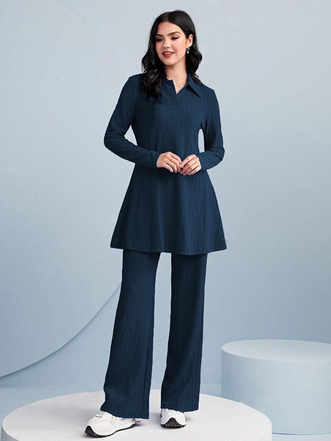 TADKEE Women’s Solid Color Two-Piece Set | Long Sleeve Top & Wide Leg Pants Co-ord Set | Casual Wear Co ord Set